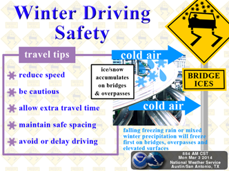* Use caution on roadways, as there may be slick spots on rural roads, bridges,