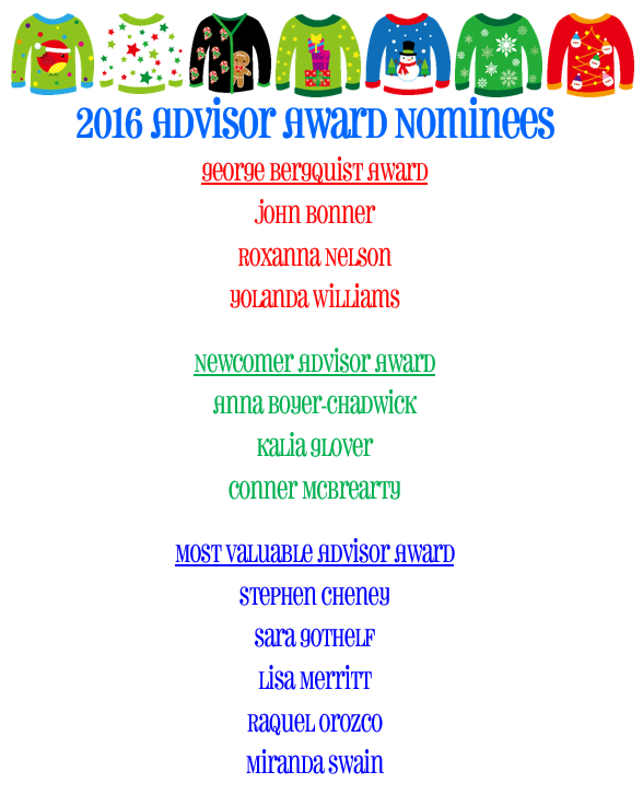 Below is the list of nominees for this year's advisor awards. Congratulations to all