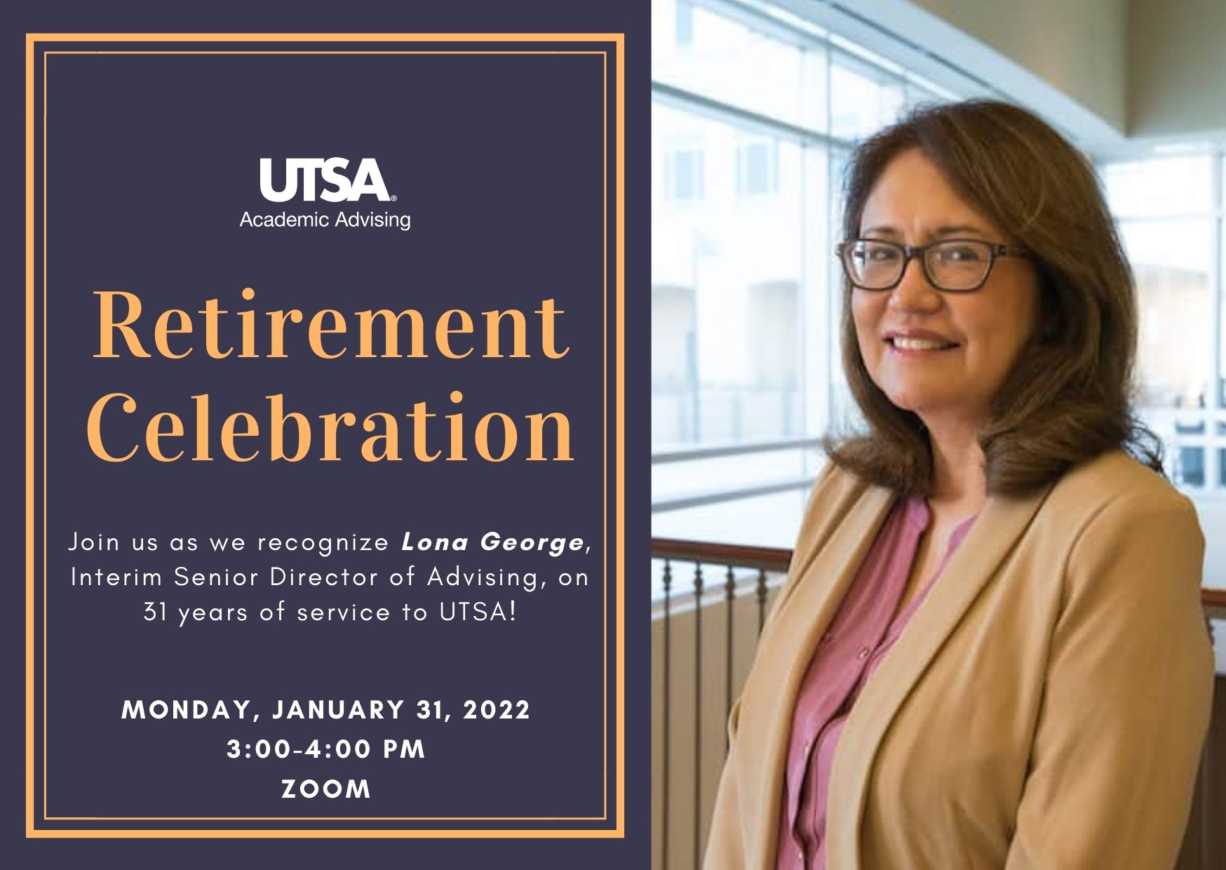 Please join us as we celebrate Lona George on 31 years of service to UTSA and her upcoming
