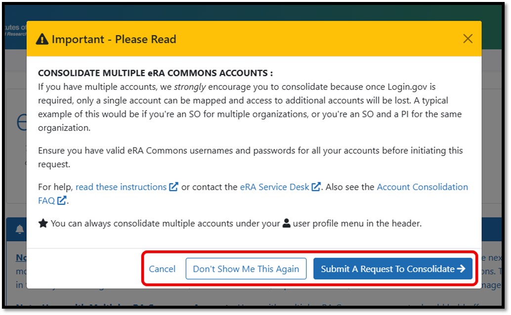 All users will be presented with the option to consolidate accounts following login to eRA