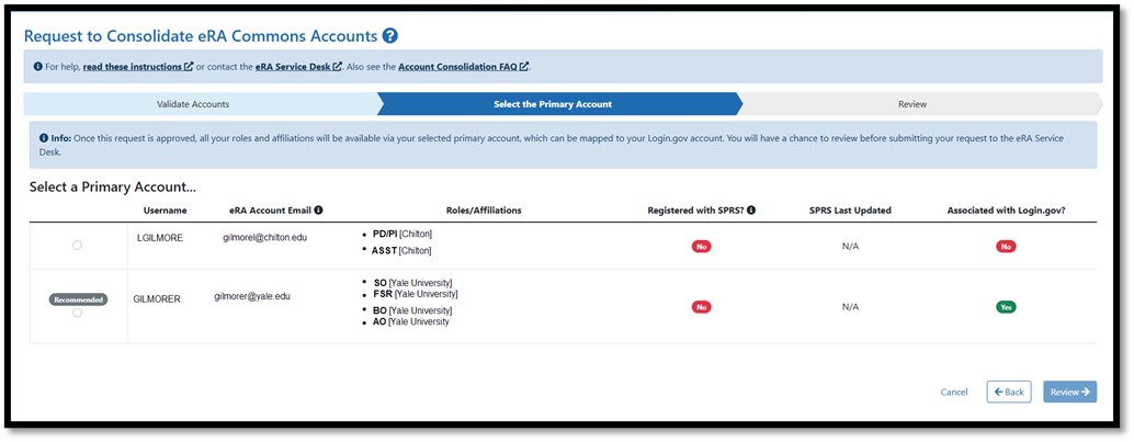 [Request to Consolidate eRA Commons Accounts Screen second step showing selection of the